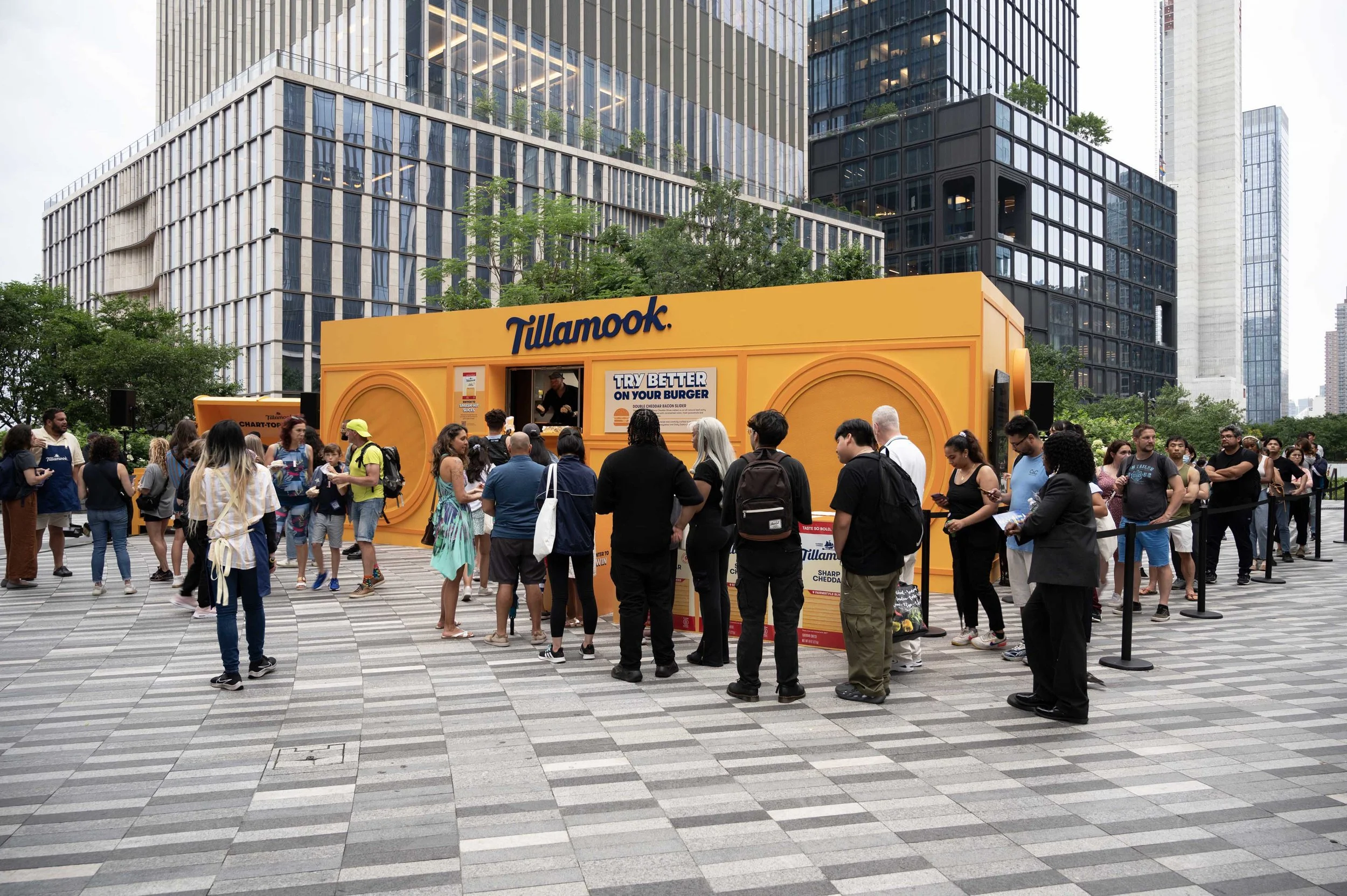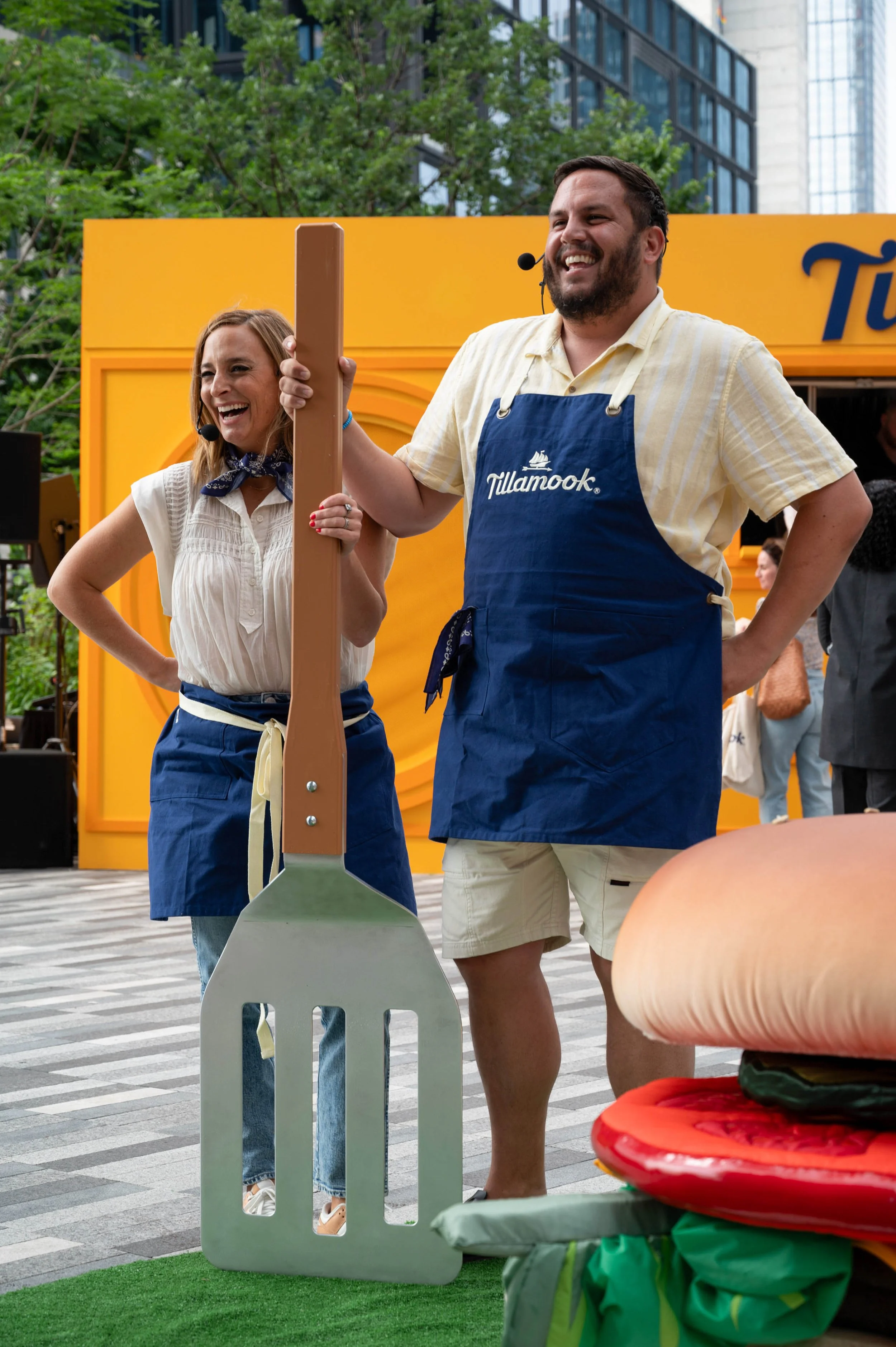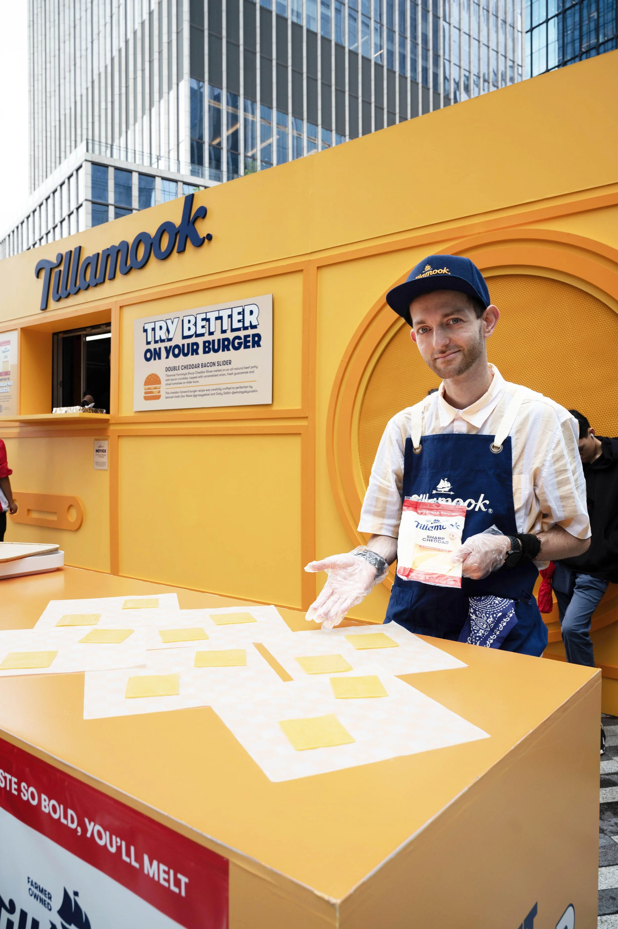 Tillamook Slices was a pop-up event with block party vibes held at Hudson Yards in NYC. The event engaged guests with games and showcased Tillamook Slices, cheddar cut thick, during the week before July 4th as the go-to choice for upping their burger game. The food truck was made into a giant boombox and photo op, and the oversized BBQ grill worked as both a DJ booth and demo area for chef influencers to showcase how to make their perfect burger recipe.